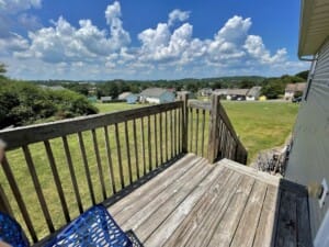 There is tile flooring in the kitchen, and the back door leads out to an open deck overlooking the large backyard and views of the mountains in the distance.