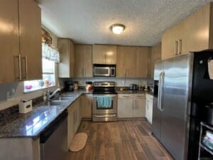 The covered front porch leads into the living room with laminate flooring, and then into the eat-in kitchen with appliances and lots of cabinet space.